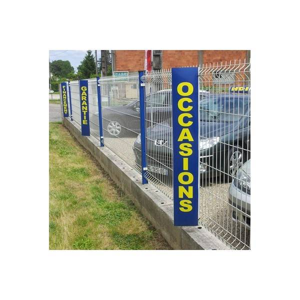 Le totem de clôture personnalisé (aussi appelé triangle de clôture) est l'outil de signalétique idéal. Il vous permet d'afficher le texte de votre choix — "Occasions", "Reprises", "Garantie", ou simplement votre logo — directement sur les zones de passage.